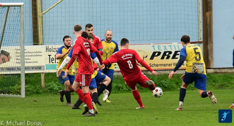 Denn eigentlich hatte der Nachmittag zunächst seinen erwarteten Verlauf genommen, als Tom Marks die Gäste nach drei Minuten mit 1:0 in Führung gebracht hatte. Doch nicht erst, nachdem Felix Hahn mit dem 1:1 alles wieder auf Anfang stellte (24.), deutete sich an, warum die Heyrothsberger den ganz langen Weg gehen sollten. Denn auch ein halbes Dutzend gefährlicher Abschlüsse konnte nicht darüber hinwegtäuschen, dass sie mit ihrem statisch-verkopften Ansatz verzettelten und schlichtweg an der gelben SG-Wand abprallten. Entsprechend haderte Gieseler: „Der Platz und der Gegner haben es nicht zugelassen. Trotzdem probieren wir es vor allem in der ersten Hälfte im Barça-Stil und mit viel Tiki-Taka.“ Doch immerhin: Inmitten von viel brotlosem Ballbesitz und einem Meer aus Schermener Abwehrbeinen fand Alexander Vasükov noch vor der Pause eine Lücke und schob zur 2:1-Führung ein (32.).