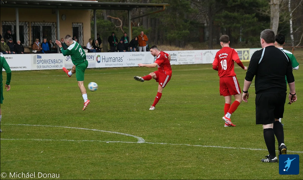 Ohnehin standen in der Anfangsphase des Sonnabend die beiden Schlussmänner im Mittelpunkt. Nachdem Johannes Wöhler gegen TSG-Stürmer Nils Karbe etwas wenig Eindeutiges zwischen Ball und Gegner getroffen hatte, zeigte Schiedsrichter Tobias Petzke (Bismark) auf den Elfmeterpunkt – mit dem bekannten Ausgang pro Leopold. Auf der Gegenseite hatte sich bis zur Pause Alexander Vasükov auf den Weg gemacht, scheiterte aber an einer Glanztat von Grün-Weiß-Schlussmann Luca Rudolf.